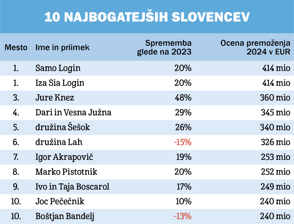 Na vrh lestvice 100 najbogatejših Slovencev sta se torej letos vrnila Iza Sia Login in Samo Login, vsak s premoženjem po 414 milijoni evrov. Zakonca sta leta 2017 za približno 650 milijonov evrov prodala večinski delež v razvijalcu zabavnih aplikacij Outfit7. Ker sta se jeseni 2021 zasebno razšla, ju pripravljalci lestvice s po polovičnim deležem na lestvici obravnavajo vsakega posebej. »Ob visoki inflaciji, ki smo ji priča v zadnjih letih, in rasti vrednosti vsega okoli nas smo v želji po čim bolj realnem prikazu premoženja posegli v metodologijo in kupnine prilagodili za 20-odstotno spremembo vrednosti denarja v zadnjem triletnem obdobju. Ob več kot 30-odstotni rasti nepremičnin v triletnem obdobju in več kot 50-odstotni donosnosti delnic na ljubljanski borzi namreč težko vztrajamo pri tem, da najuspešnejši slovenski podjetniki ne zmorejo (vsaj) ohranjati kupne moči svojih milijonov. Iza Sia in Samo Login si tako na tokratni lestvici znova delita prvo mesto,« pojasnjujejo pripravljalci lestvice. Dodajajo, da če bi v minulih letih vedeli za takšen razplet inflacijske zgodbe - predvsem da bo v zadnji etapi vodila v tako veliko rast vrednosti naložb -, bi Loginovima že prej zvišali vrednost ocenjenega premoženja in bi ohranila številko ena deseto leto zapored (namesto da bi jo za leto dni prepustila družini Lah). »A si tega nismo upali, tudi zato, ker smo bili pod vtisom poka obvezniškega balona in s tem povezanih nevšečnosti pri plemenitenju (oziroma ohranjanju vrednosti) premoženja,« sklenejo.