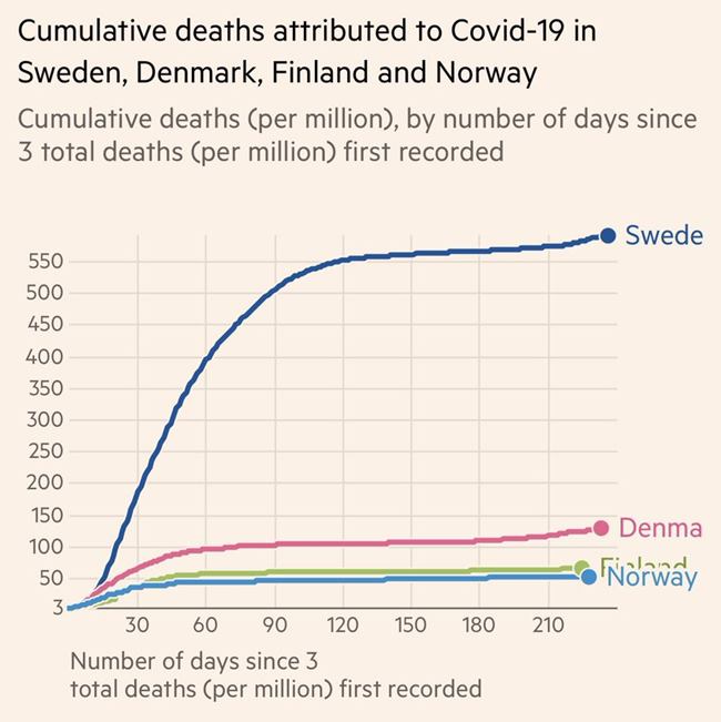 Graf Financial timesa, ki prikazuje delež smrti zaradi covida-19 na milijon prebivalstva v skandinavskih državah od prvih treh smrtnih primerov naprej.