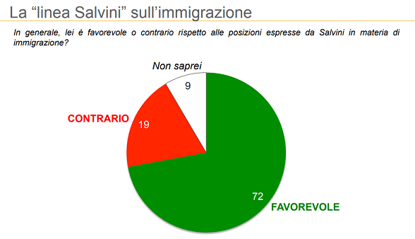 Še bolj pa je uspeh Lige osupljiv ob dejstvu, da so ji ankete še februarja 2018 kazale 13,4 %. Na marčevskih volitvah je nato dobila 17,4%, Gibanje 5 zvezd pa 32,5%. Salviniju se lahko smeje tudi ob podpori njegovi politiki do migrantov, ki jo podpira kar 72%, le 19% vprašanih pa ji nasprotuje