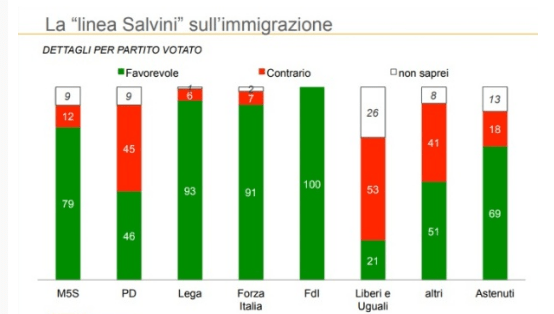 Odstotki v korist Salvinijevi politiki so zelo zanimivi tudi po strankarskem prerezu vprašanih. Poleg lastne stranke ima podporo tudi pri volivcih ostalih desnih strank ter v veliki večini Gibanja 5 zvezd. Več kot polovično podporo pa celo pri volivcih Demokratske stranke, ki je sicer Salvinijev največji kritik.