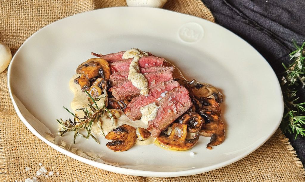 - Meso narežemo na pol centimetrske rezine. Na krožnik damo najprej omako s šampinjoni, nanjo pa položimo rezine mesa, ki jih še dodatno posujemo z grobo soljo, sveže mletim poprom ter prelijemo z nekaj kapljicami omake in oljčnim oljem.