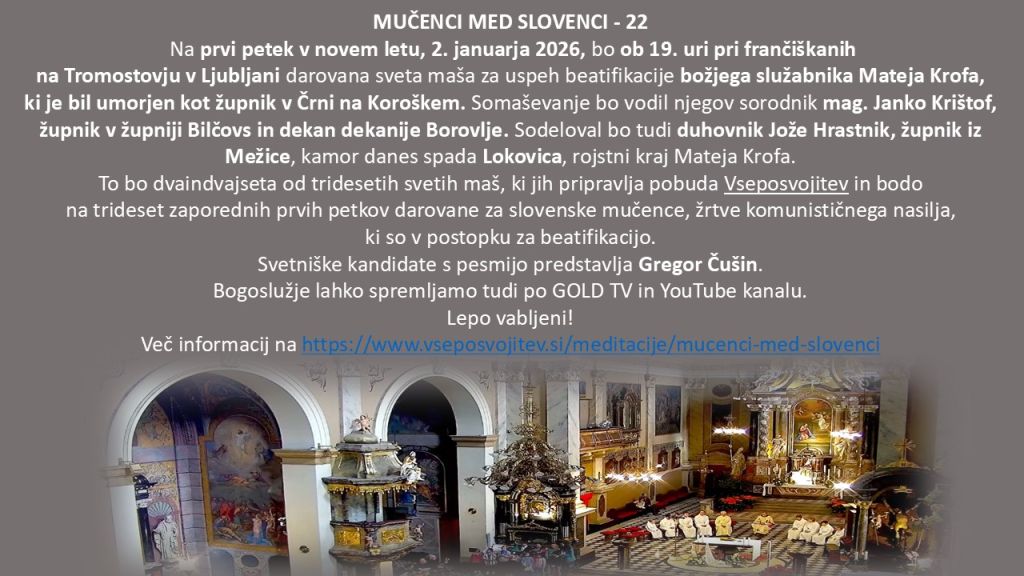 Prvo sv. mašo v okviru pobude Vseposvojitev v letu 2026 bodo pri frančiškanih darovali za duhovnika Mateja Krofa, umorjenega kot župnika v Črni na Koroškem leta 1945. Somaševanje bo vodil njegov sorodnik Janko Krištof, župnik v župniji Bilčovs in dekan dekanije Borovlje. Sodeloval bo tudi duhovnik Jože Hrastnik, župnik iz Mežice, kamor danes spada Lokovica, rojstni kraj Mateja Krofa. Dvaindvajseta od tridesetih svetih maš za slovenske mučence, žrtve komunističnega nasilja, bo 2. januarja v Ljubljani pri frančiškanih na Tromostovju. Kot običajno bo svetniškega kandidata v verzih predstavil Gregor Čušin.