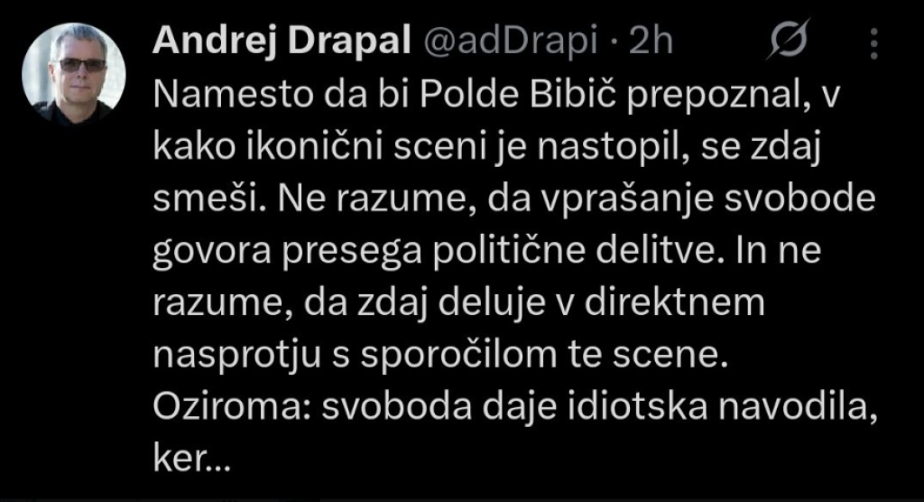 Odlična analiza, Igor! Sama sem tako Partljiča kot Bibiča zmeraj spoštovala kot pisatelja in igralca, a nikoli nisem pomislila na to, kar predstavljaš v svojem komentarju. Sem se pa čudila njunim političnim kandidaturam. Enako velja za odlično igralko Mileno Zupančič, ki sicer ni nikjer kandidirala (ne da bi jaz to zasledila), je pa v svojih javnih nastopih izrazito kritična do desne politične opcije. Meni nerazumljivo. Partljič je napisal tudi roman o tem, kako so bili po 1945 pod kontrolo prebivalci ob severni meji in o prebežnikih, ki so bili pri svojih podvigih pogosto ob življenje. Ne glede na vse: vsi, ki jih omenjam zgoraj, so (bili) odlični v svojih igralskih in pisateljskih vlogah. Odziv na plakat pa je popolnoma neprimeren in pri ljudeh, ki mislijo s svojo glavo, negativno sprejet. Ker pa sem dosti med ljudmi, pa vem, da je takih ljudi še zmeraj premalo.