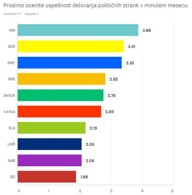 Povprečna ocena je SDS-u tokrat nekoliko padla, a ne toliko, da bi zaostala za tretjo SMC, kateri pa je ocena narasla. Od ostalih je poskočila tudi Levici, močno, za pol ocene pa padla Socialnim demokratom.