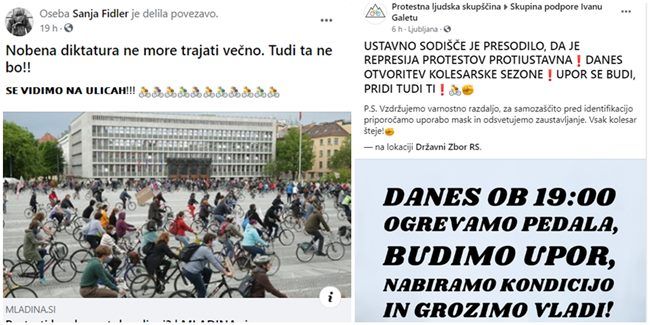 Prvi obraz kolesarskih protestnikov Jaša Jenull tako že javno poziva k shodu danes zvečer na kolesih pred parlamentom, podobni pozivi so tudi v skupini v podporo Ivanu Galetu, skupini Vseslovenska vstaja naroda in drugje.