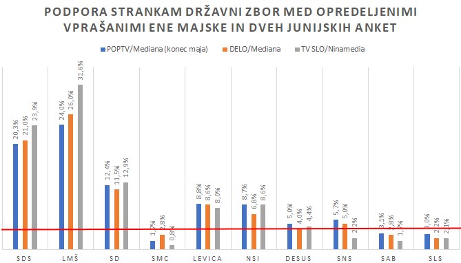 Če upoštevamo samo opredeljene volivce in k anketi Ninamedie dodamo Delovo anketo izpred tedna dni ter anketo Mediane, za POP TV izvedeno tik pred volitvami v Evropski parlament, dobimo spodnjo primerjavo