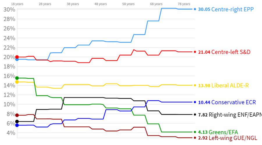 EPP tako najmanj glasov dobi ravno med najmlajšimi, torej volivci do 30 let, kjer odstotek Evropske ljudske stranke pade celo pod 20. EPP pa je nato zmagovalka v vsaki starostni skupini starejši od 30 let. Pri volivcih stareješih od 70 let pa odstotek za Evropsko ljudsko stranko zrase celo nad 30.
