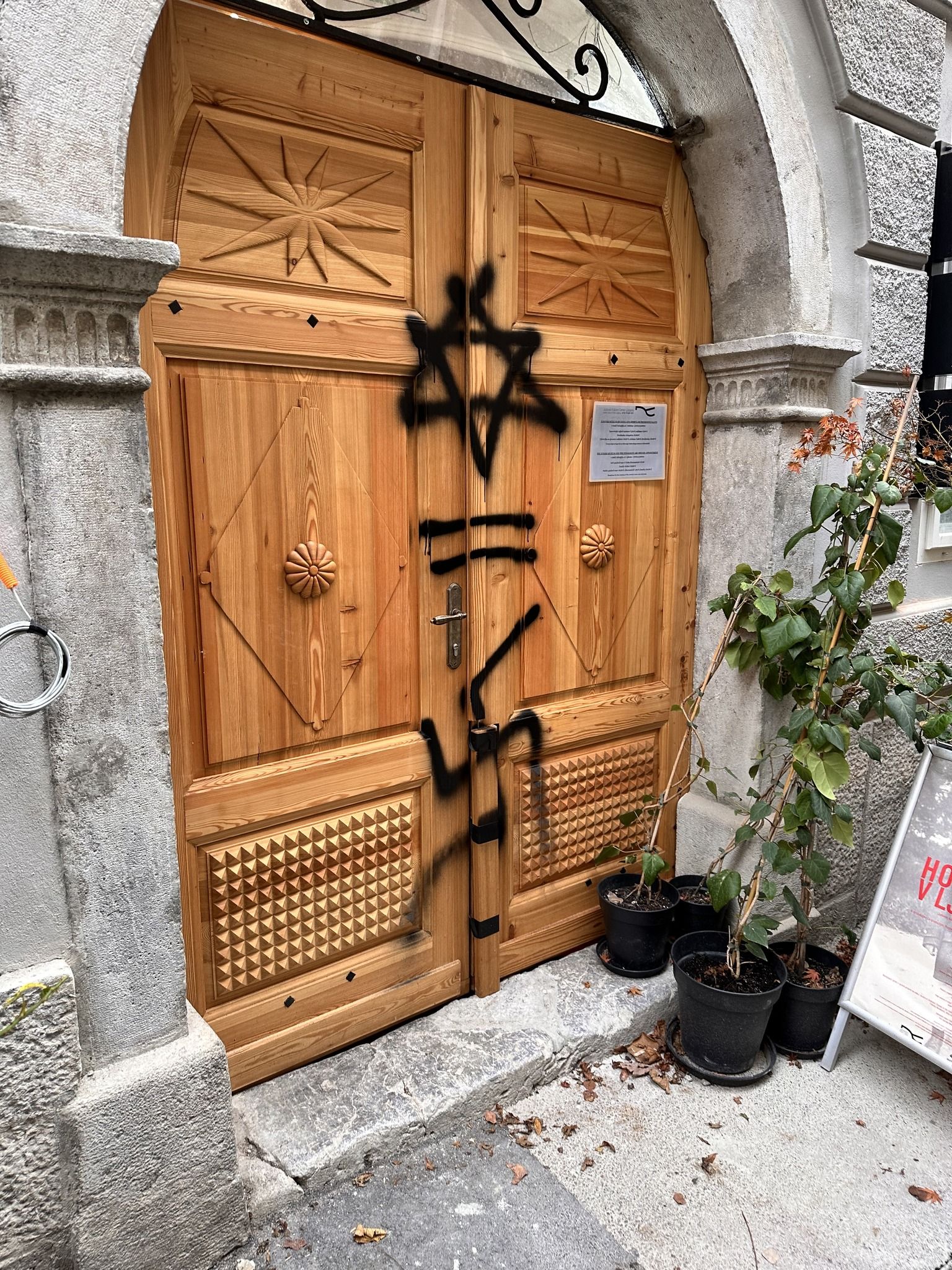 Slovenijo danes pretresa vest o napadu nestrpnosti na Judovski kulturni center v Ljubljani, na vrata katerega so nestrpneži ponoči narisali judovsko zvezdo in jo izenačili s svastiko.