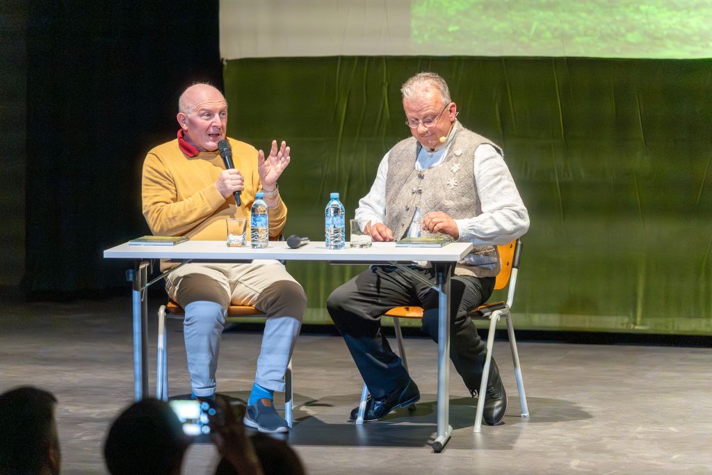V prvem delu večera je Solčavan Nejc Slapnik v narečju vodil pogovor z jezikoslovcem dr. Petrom Weissom, strokovnjakom za dialektologijo na Inštitutu za slovenski jezik Frana Ramovša ZRC SAZU v Ljubljani. V prijetni, živahni in tudi duhoviti razpravi, prežeti s številnimi zanimivimi jezikovnimi uvidi, je dr. Weiss predstavil svojo najnovejšo knjigo Ob Savinji in Dreti, ki je nastala na podlagi prispevkov o ustrezni rabi nekaterih krajevnih imen v Zgornji Savinjski dolini, objavljenih leta 2024 v tedniku Savinjske novice. Bogato jezikovno gradivo dopolnjujejo zemljevidi ter skrbno izbrane fotografije, ki bralcu še dodatno približajo kraje, o katerih knjiga pripoveduje.