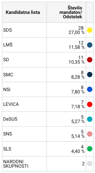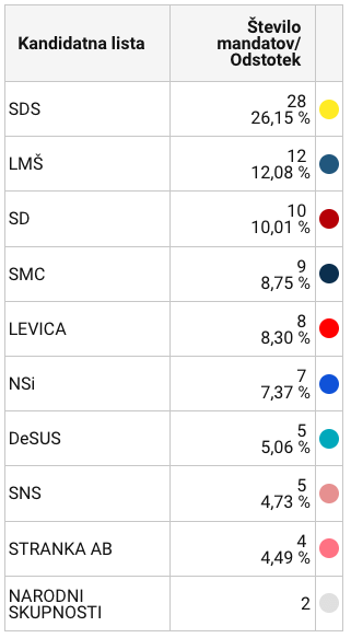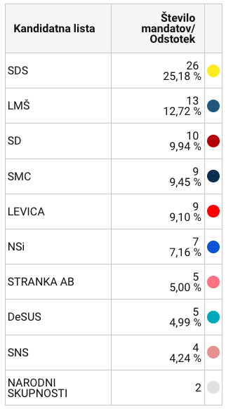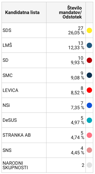 Zaključujemo spremljanje izida volitev v živo. Rezultati 22:30, po 98,98% glasov (dobrih 873.000 glasov). SDS je izgubila eno poslansko mesto, pridobila ga je SMC.
