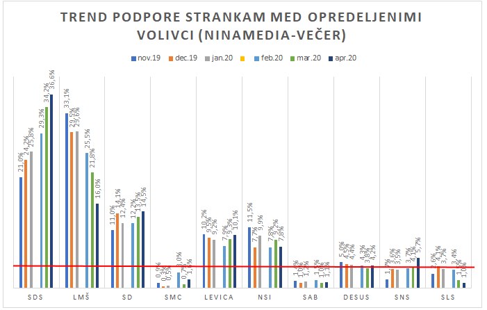 Trend podpore med opredeljenimi sodelujočimi v anketah Ninamedie kaže naraščanje podpore SDS-u ter eksponenten padec podpore LMŠ-ju. A ta se večinoma ne preliva v druge leve stranke, temveč predvsem med neopredeljene, katerih delež narašča.