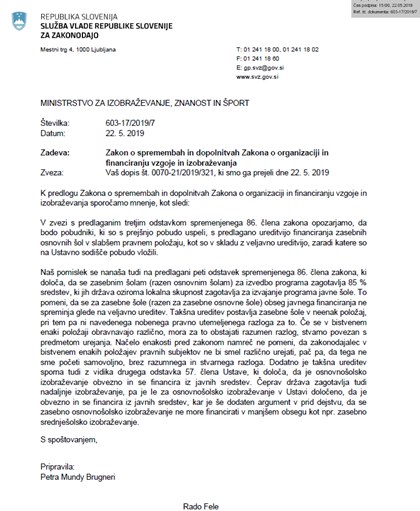 Pri tem je ignorirala mnenje Službe Vlade RS za zakonodajo, ki opozarja, da predlagana sprememba pobudnike, ki so uspeli na ustavnem sodišču, postavlja v slabši pravni položaj, kot so ga imeli ob vložitvi pobude. Prav tako pa strokovna služba meni, da predvidena ureditev vse zasebne šole postavlja v pravno neenak položaj, za kar ni navedenega nobenega pravno utemeljenega razloga.