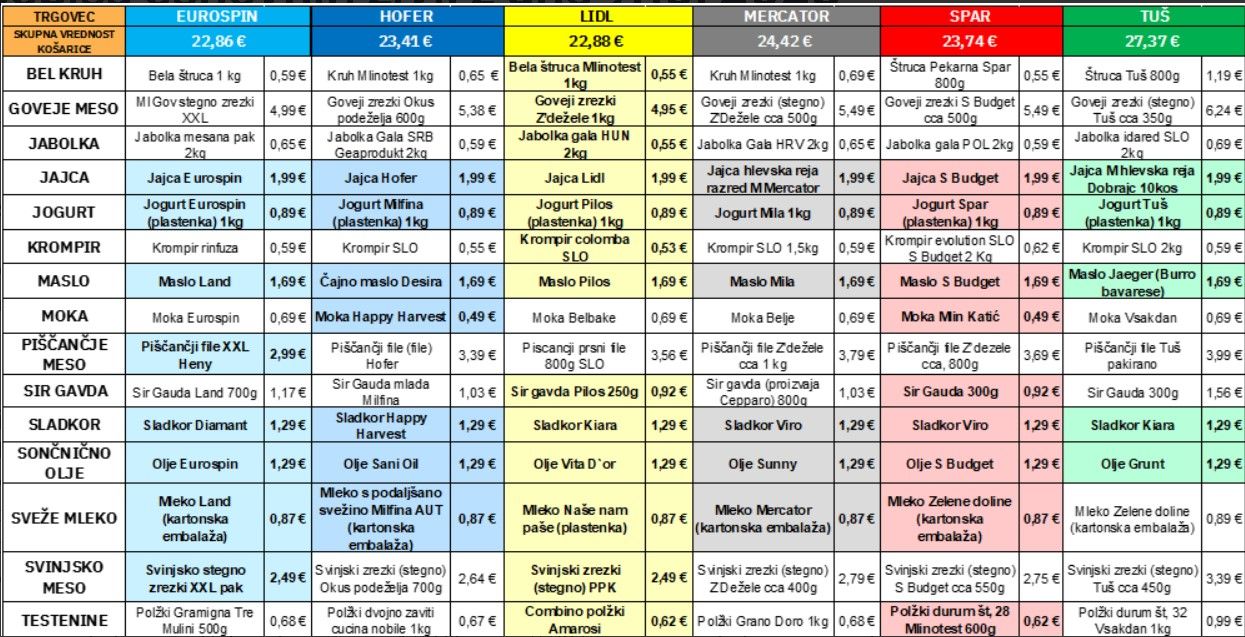 Analize Statističnega urada kažejo, da se draži praktično vse – najbolj, za dobro polovico, so se od leta 2015 do danes podražili stanovanjski stroški (voda, elektrika, plin …), za dobrih 28 odstotkov so se podražile storitve, za slabih 40 odstotkov pa so se dvignile tudi cene hrane in pijače. Vlada vsaj domnevno za boj proti veliki rasti cen spremlja cene košarice 15 živil, ki pa se – diametralno nasprotno z inflacijo – skoraj od začetka spremljanja le ceni. Ob zadnjem popisu je bila tako zopet najcenejša doslej. Na to diskrepanco med temi nekaj živili in splošno draginjo vseh ostalih izdelkov kaže tudi vse manjši obisk ljudi na spletni strani primerjaj-cene.si.