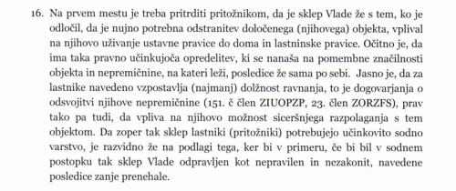 Dopisali so, da iz strokovnih mnenj, ki se nanašajo na objekte v tej zadevi, izhaja, da posamezni obravnavani »objekt formalno ne izpolnjuje obeh pogojev iz drugega odstavka 151. a člena Zakona o interventnih ukrepih za odpravo posledic poplav in zemeljskih plazov iz avgusta 2023 (ZIOPZP), vendar pa gre za objekt, ki je ogrožen zaradi poplav.« Po mnenju Vrhovnega sodišča bo sodišče prve stopnje v novem postopku moralo ugotavljati, ali je to skladno z zakonom.