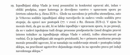 Sodišče je še dodalo, da ni mogoče izključiti, da bi uspeh pritožnikov v tem upravnem sporu in morebitna odprava sklepa vlade lahko vplivala na nadaljnjo veljavnost že sklenjenih pravnih poslov. Izpodbijani sklep je je Vrhovno sodišče razveljavilo in zadevo vrnilo na sodišče prve stopnje, da opravi nov postopek.