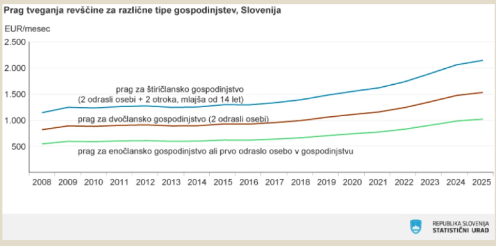 V Sloveniji se povečuje število ljudi, ki živijo pod pragom tveganja revščine. Po najnovejših podatkih Statističnega urada Republike Slovenije (SURS) je bilo lani tveganju revščine izpostavljenih 14,3 odstotka prebivalcev, kar pomeni približno 298.000 oseb oziroma 22.000 več kot leto prej. Stopnja tveganja se je tako v primerjavi z letom 2024 zvišala za 1,1 odstotne točke.