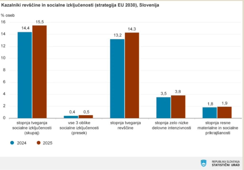 Poleg revščine se je povečalo tudi tveganje socialne izključenosti. Lani je bilo temu tveganju izpostavljenih 15,5 odstotka prebivalcev oziroma približno 324.000 oseb, kar je prav tako 22.000 več kot leto prej. Stopnja tveganja socialne izključenosti se je v primerjavi z letom 2024 zvišala za 1,1 odstotne točke.