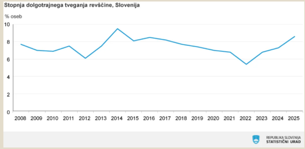 Narašča tudi dolgotrajno tveganje revščine. Njegova stopnja je dosegla 8,6 odstotka, kar je 1,3 odstotne točke več kot predlani. Po podatkih SURS stopnja tveganja revščine v celotnem mandatu vlade Roberta Goloba vztrajno narašča.