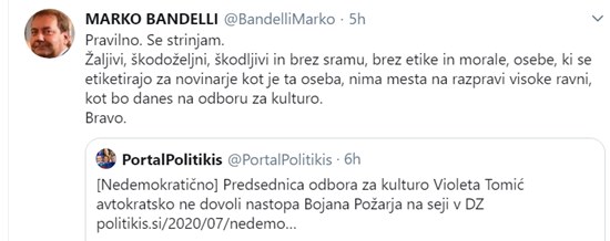 Predsedujoča odboru za kulturo DZ RS Violeta Tomić (Levica) je z diskriminatornim vnaperjšnjim izločanjem ter selektivnim izbiranjem potencialnih udeležencev razprave po osebni presoji pokazala in dokazala, kako omejeno in ozkosrčno si ona in njena ekstremistična levičarska stranka predstavljata demokracijo in pravico do javne besede v slovenskem parlamentu.