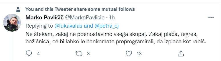 Vsak podjetnik daje plače in nagrade glede na dodano vrednost, rezultate poslovanja in motiviranju zaposlenih za njihovo delo. Če pa svetujete podjetnikom, da dodatno bremenijo svoje poslovanje in zato zaprejo, potem pa je rezultat sledeč. Dobite nove nezaposlene, ki so demotivirani in postanejo breme države. Torej tudi vas. Vsak dodatni nezaposlen je neuspeh za vlado in za ostale državljane. In na koncu bo manj tudi za NVO-je, ki jih Mesec tako rad plačuje za njihovo nedelo. Predlagam, da naj najprej oni zaprejo svoje NVO-je, če niso sposobni na trgu najti dela, ki jim bo omogočalo tudi izplačilo božičnice. Pa brez državnega denarja.