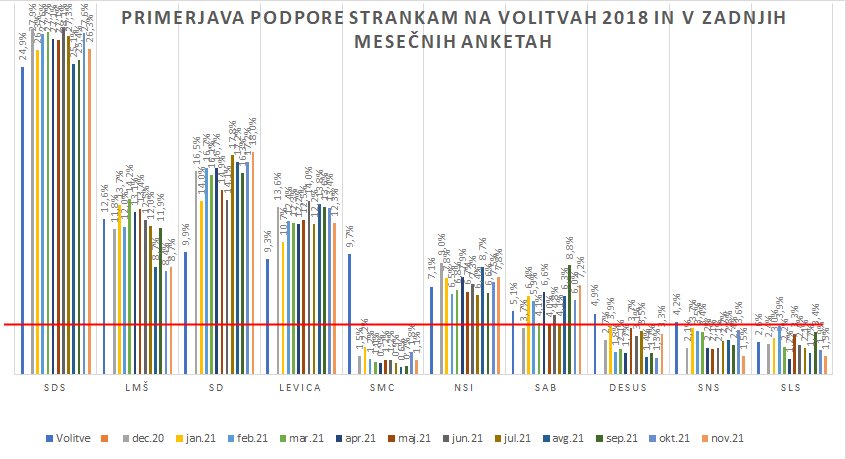 Če v en graf združimo povprečne odstotke med opredeljenimi anketiranci petih različnih javnomnenjskih anket, ki so jih televizijske hiše opravile v novembru - in sicer Medianine za Delo in POP TV, Ninamedio (Večer/Dnevnik) ter dve Parsifalovi - za Novo24 ter za Planet TV, se izriše spodnja podpora političnim strankam.