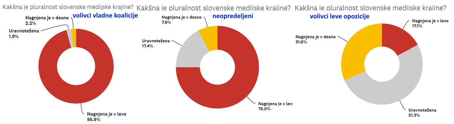 Tudi pri pogledu na to so bistvene razlike glede na nazorsko, oziroma politično usmeritev. Medtem ko praktično vsi volivci vladne koalicije (96 %) slovensko medijsko krajino vidijo kot nagnjeno v levo, tako meni tudi tri četrtine neopredeljenih sodelujočih. Enako pa je prepričanih zgolj 17 % sodelujočih podpornikov levih opozicijskih strank. Večina njih slovensko medijsko krajino vidi kot uravnoteženo, slaba tretjina pa celo meni, da je nagnjena v desno.