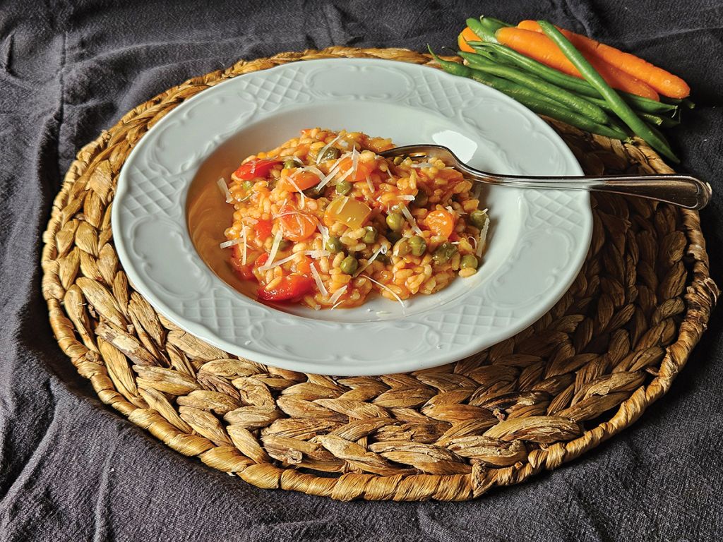 - Zelenjavno rižoto razdelimo na krožnika ter posujemo z ribanim parmezanom.