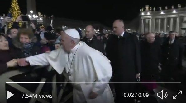 Papež Frančišek je v torek na silvestrskem srečanju pozdravil vernike, ki so prišli pogledat jaslice na Petrovem trgu. Ko je pozdravljal zbrane, ga je vernica agresivno zgrabila za roko in potegnila k sebi, on pa jo je udaril po roki in ji jezno rekel, naj ga izpusti.