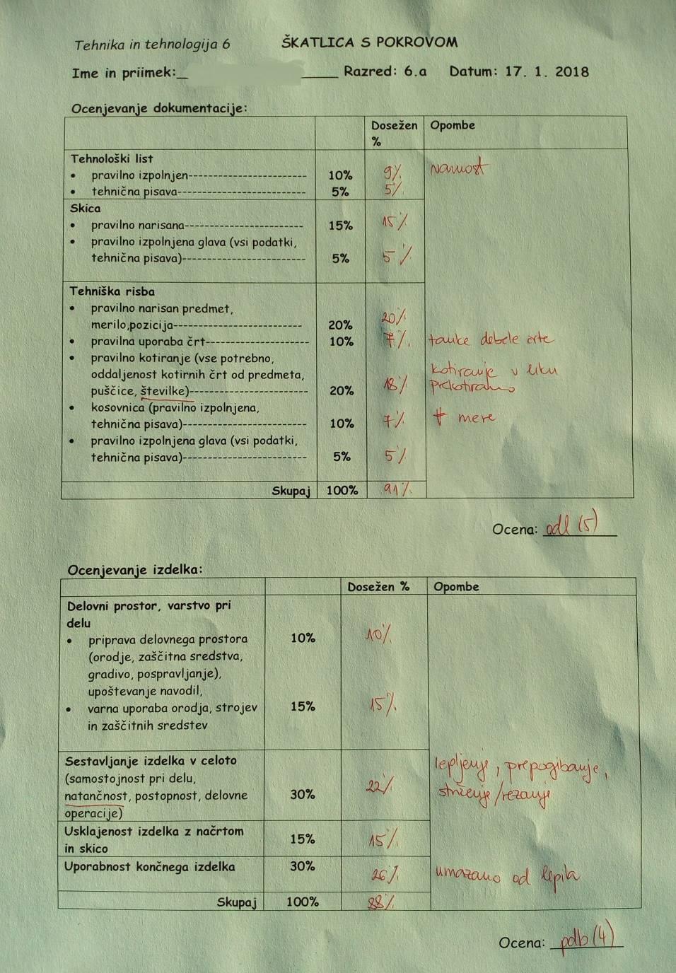 Ocenjevalni list pri predmetu tehnika in tehnologija (klik za povečavo)